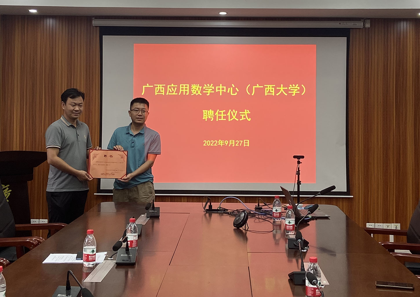 2022年9月27日下午,广西应用数学中心(广西大学)聘任仪式在广西大学数学与信息科学学院214会议室举行,我司总经理佘乾仲高级工程师应邀参加,受聘为广西应用数学中心(广西大学)副主任兼项目部副部长。广西大学数学与信息科学学院党委书记黄建荣教授、院长郭真华教授、副院长兼广西应用数学中心(广西大学)常务副主任袁功林教授等学院领导参加,袁功林教授代表中心给我司总经理佘乾仲高级工程师颁发了聘书。佘乾仲表示非常荣幸能够成为其中一员,并表示将为广西应用数学中心(广西大学)的发展做出努力,不辜负学院及中心领导的信任。
