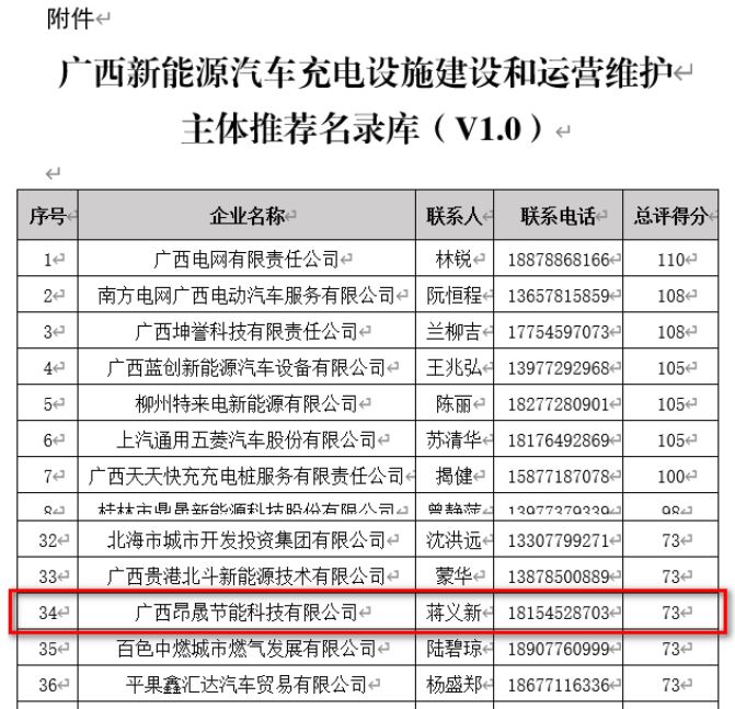 我公司成功入选广西新能源汽车充电设施建设和运营维护主体推荐名录库企业名单(第一批)